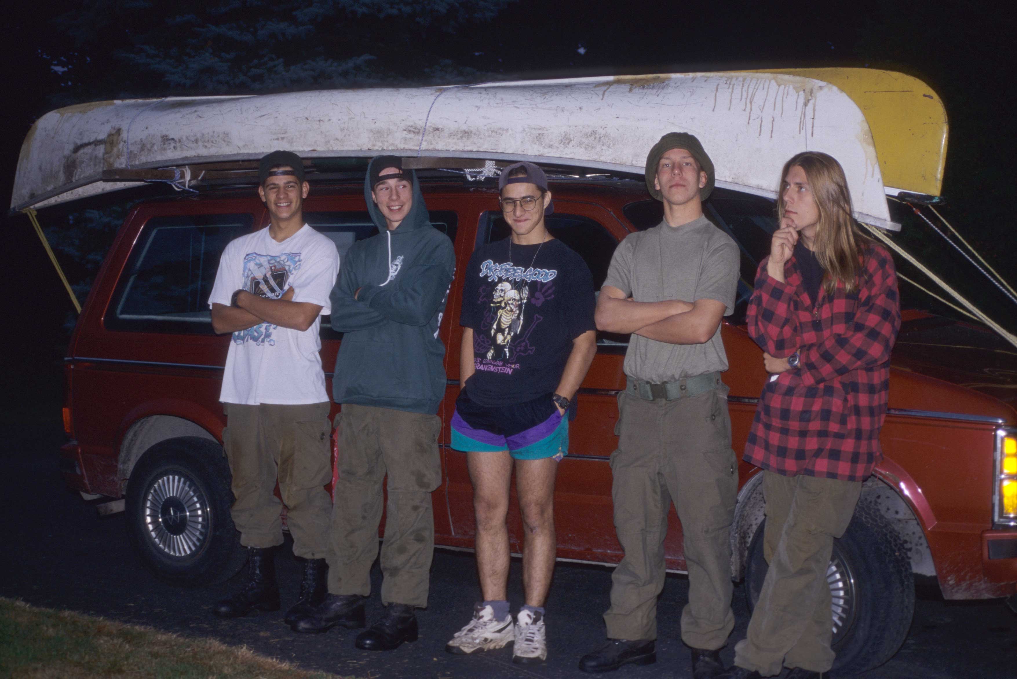 However the aging Caravan was the vehicle of choice for their first big road trip with friends; they nicknamed it the Red Rocket for the event. Jeff is in the grey T-shirt; Peter is beside him with the long hair. Savoury looking bunch!